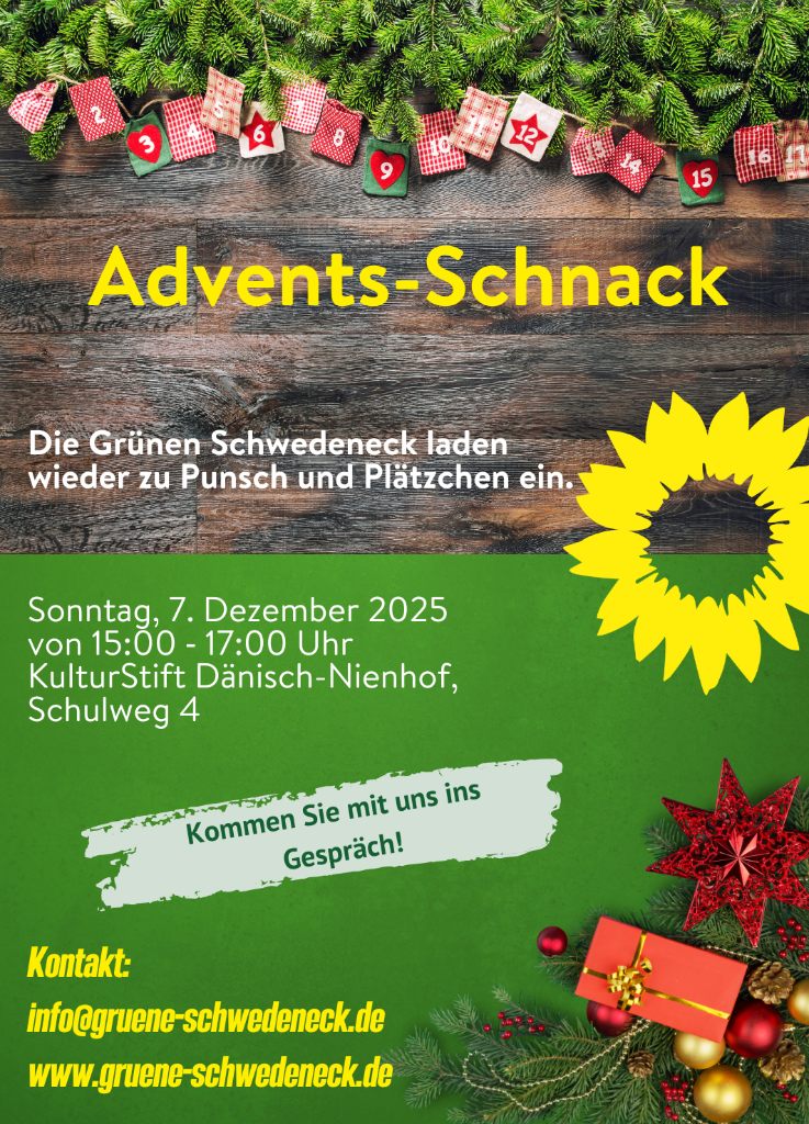 Unser grüner Advents-Schnack am Sonntag, 7. Dezember 2025 27. November 2025 Wir Grünen Schwedeneck laden euch einmal wieder zum Advents-Schnack am Sonntag, den 7. Dezember 2025 von 15 .. 17 Uhr in den Kulturstift Dänisch-Nienhof (Schulweg 4) ein.